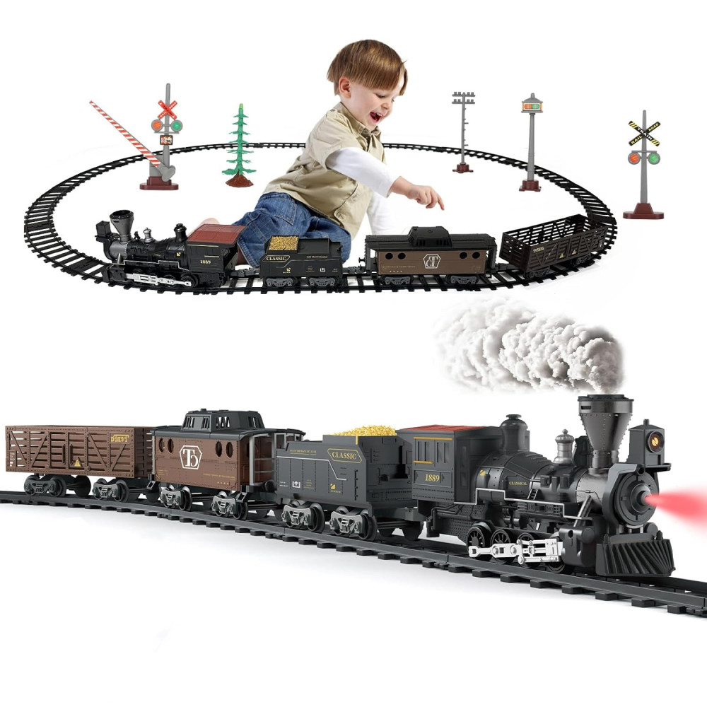 Комплект поставки: локомотив, вагонетка с углем, вагон-рефрижератор, вагон-хоппер, железнодорожное полотно (18 сегментов), железнодорожные знаки, деревья, емкость для воды