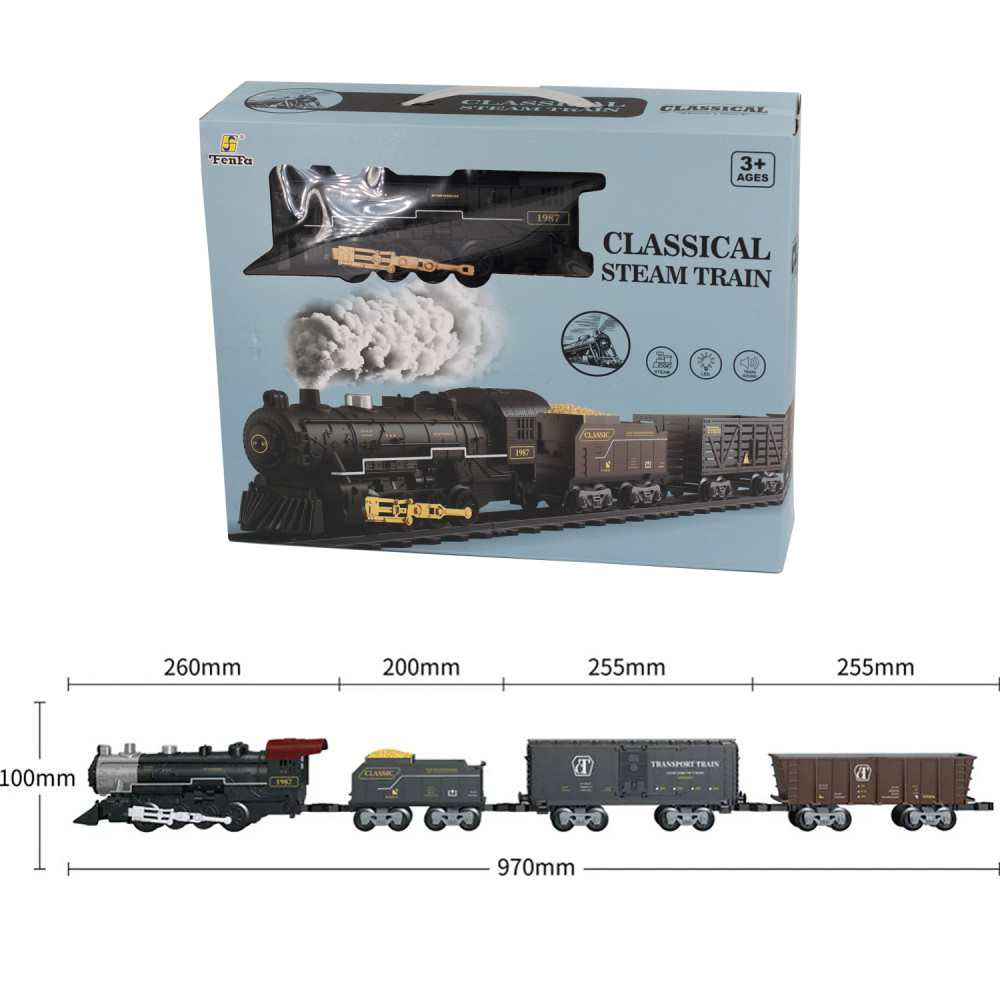 Комплект поставки: локомотив, вагонетка с углем, вагон-рефрижератор, вагон-хоппер, железнодорожное полотно (18 сегментов), железнодорожные знаки, деревья, емкость для воды