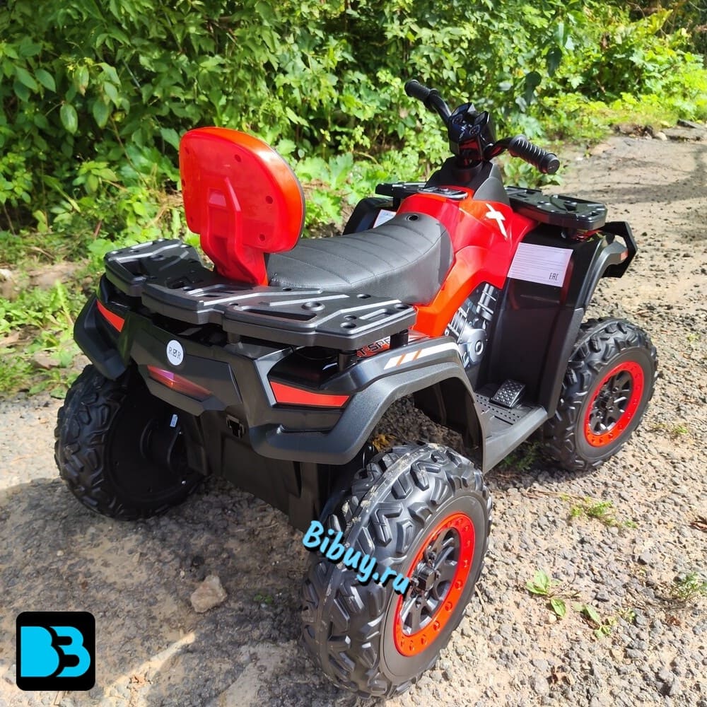 Управлять квадроциклом можно с помощью индивидуального пульта по Bluetooth или при помощи руля и педали газа. Скорость движения до 8 км/ч вперед и назад, движение вперед можно регулировать в двух режимах: повышенная/пониженная, в соответствии с навыками юного водителя. А удобное эко-кожаное сиденье шириной 40 см и глубиной 24 см гарантирует удобную посадку для ребенка.