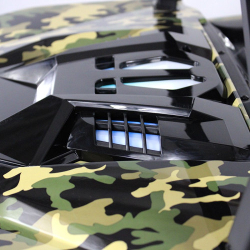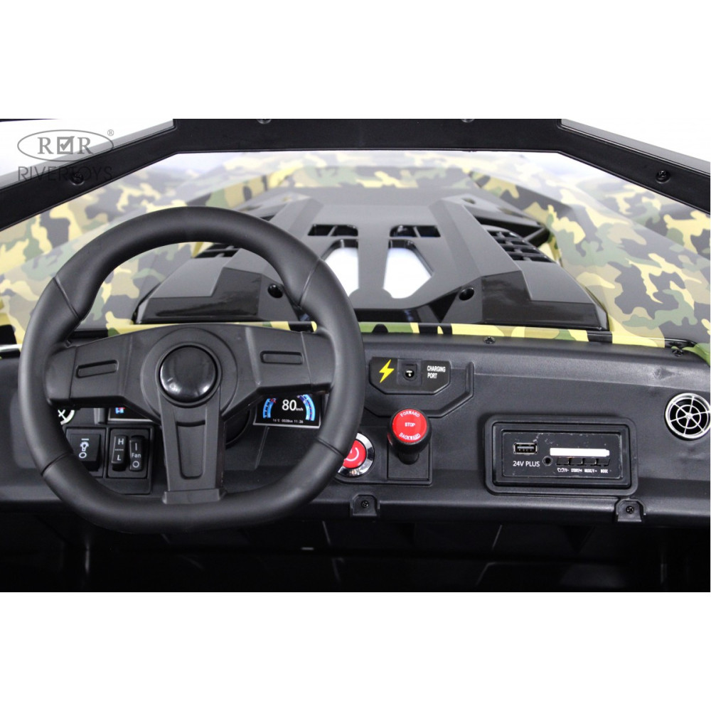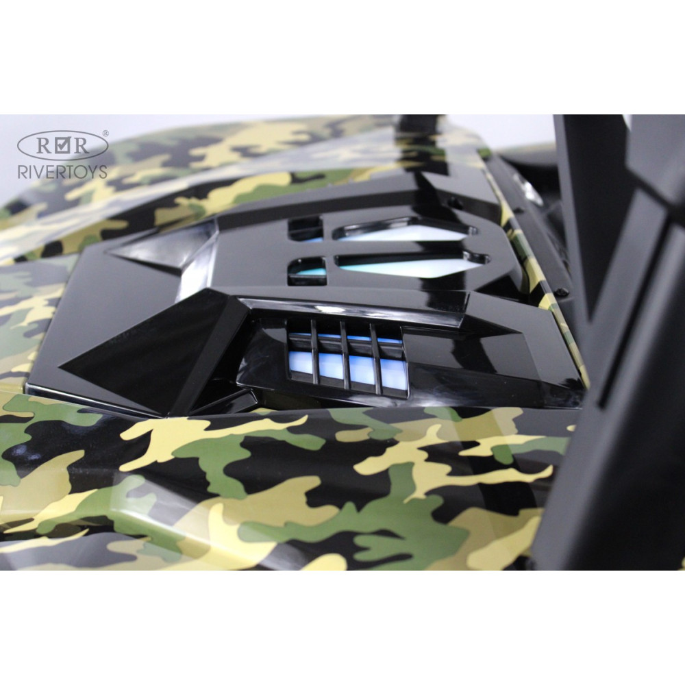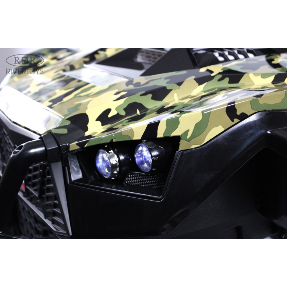 Модель радует детвору яркими опциями: передние и задние фары (включаются отдельной кнопкой), диодные огни и подсветка капота для вечерних поездок. Звуковые эффекты включают музыкальный руль с клаксоном — ребенок может "сигналить" и включать простые мелодии. Для большего веселья предусмотрена имитация кондиционера с отдельной кнопкой активации.