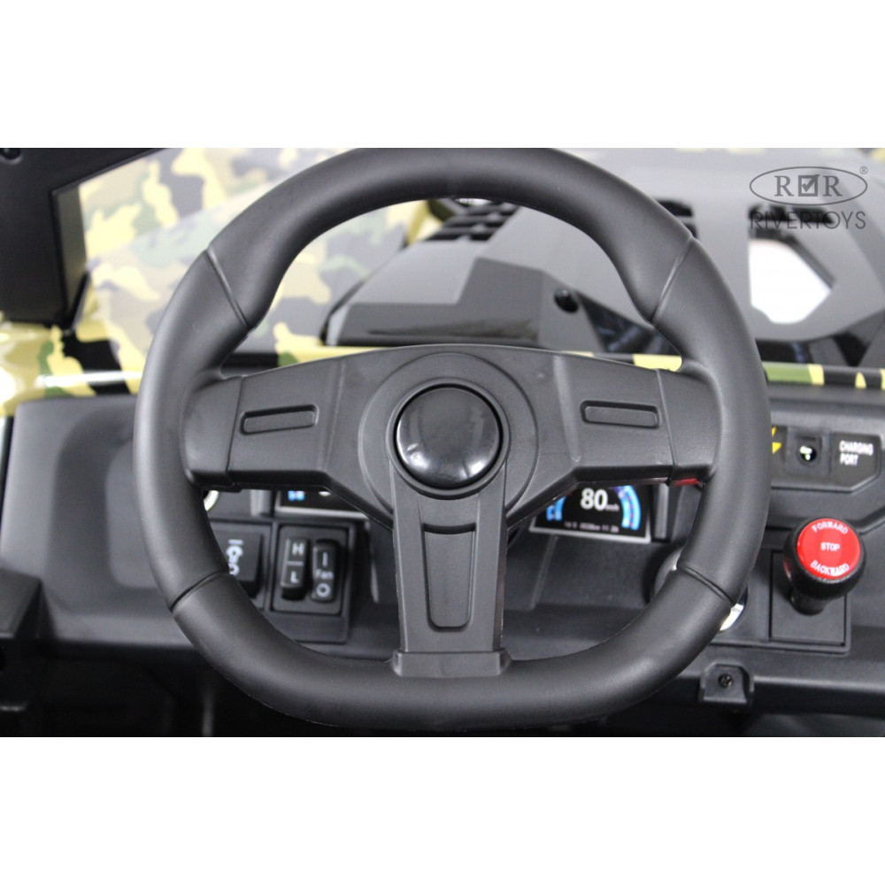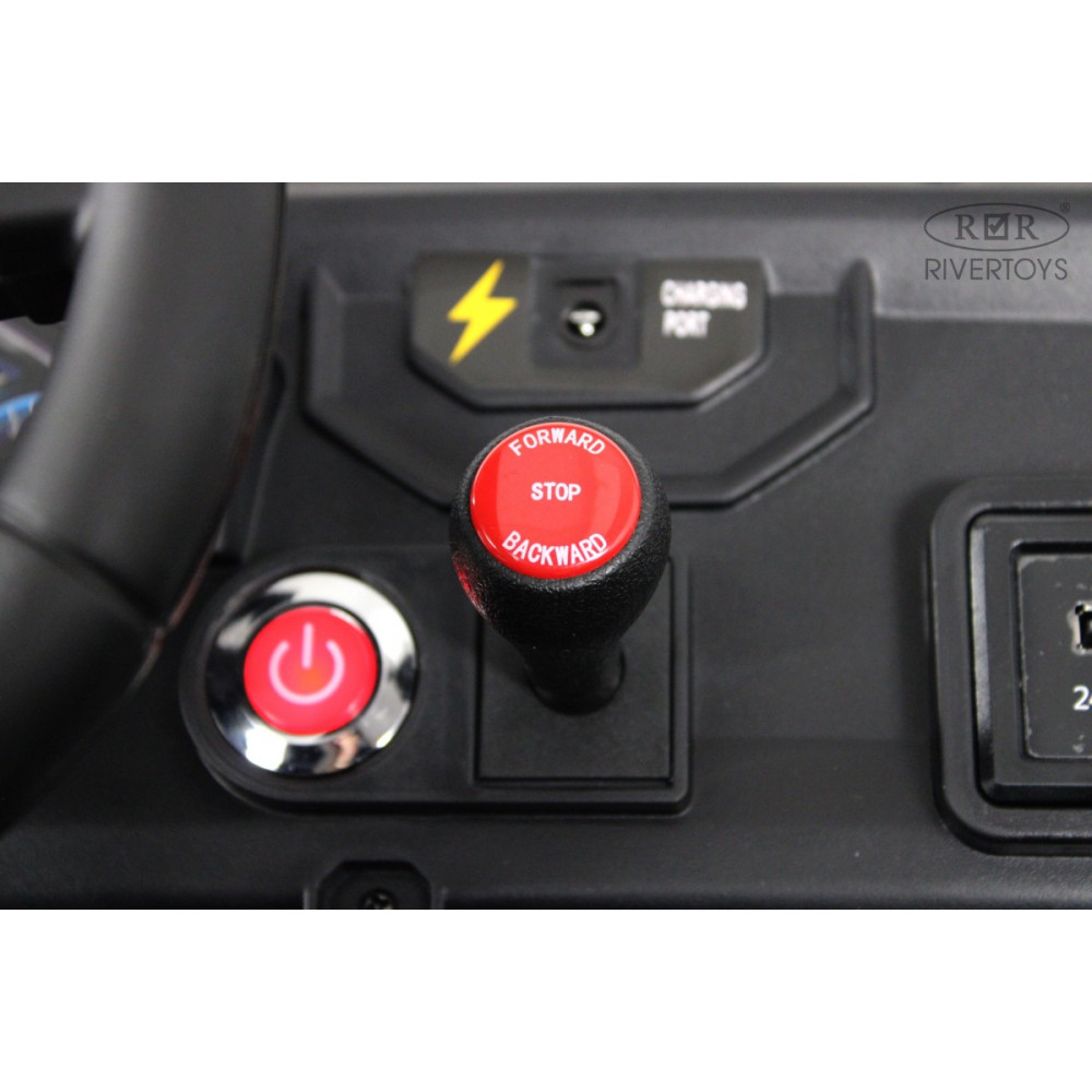 Управление простое и безопасное: включение кнопкой, движение с помощью педали газа. Скорость достигает 16 км/ч, с переключением между высокой и низкой (кнопкой на панели), чтобы родители могли контролировать динамику. Есть удобная кнопка переключения между ручным управлением педалью и пультом — это позволяет взрослым взять контроль в случае необходимости.