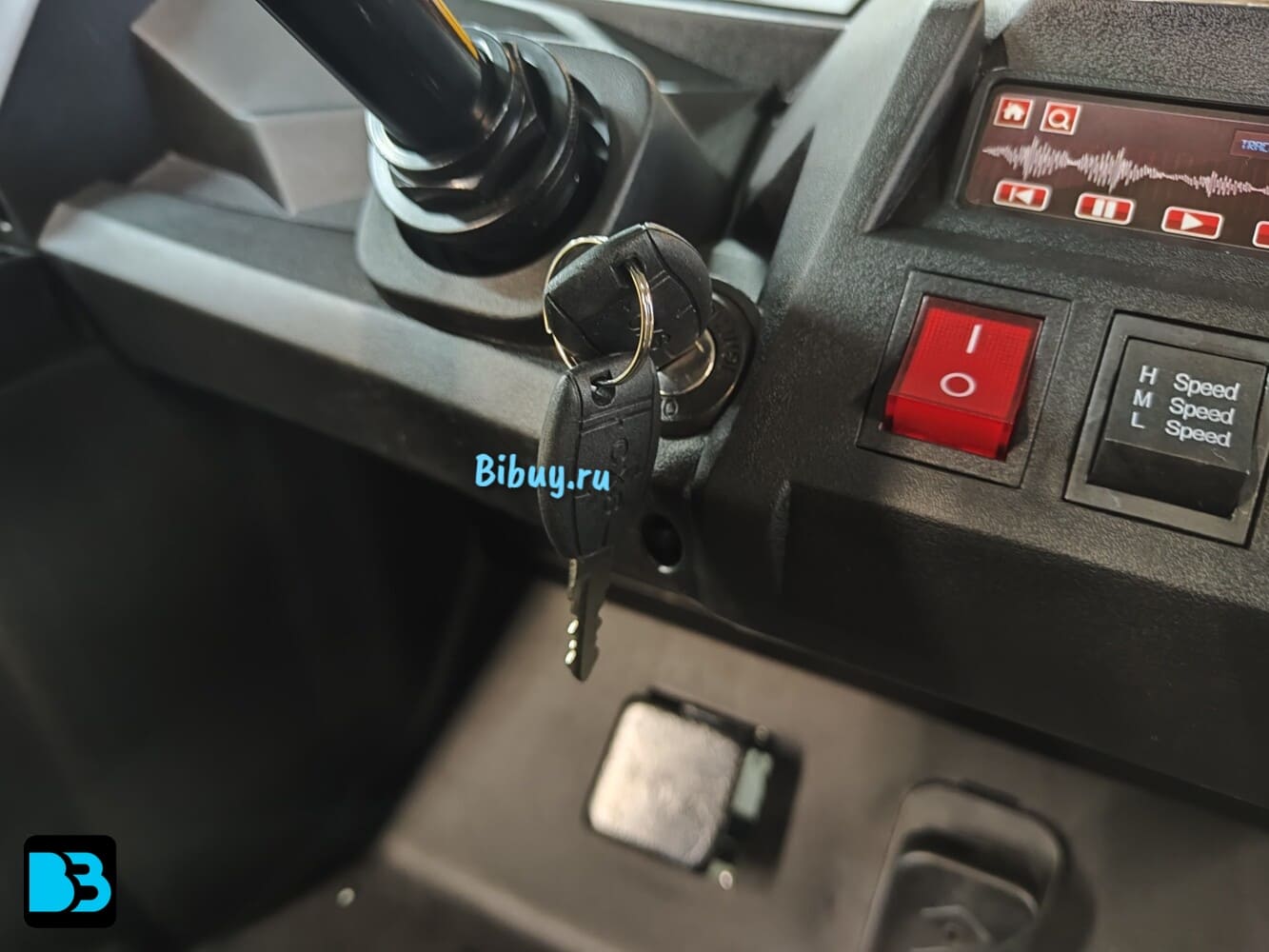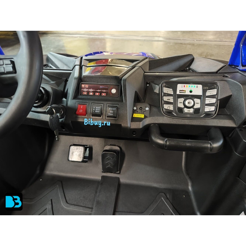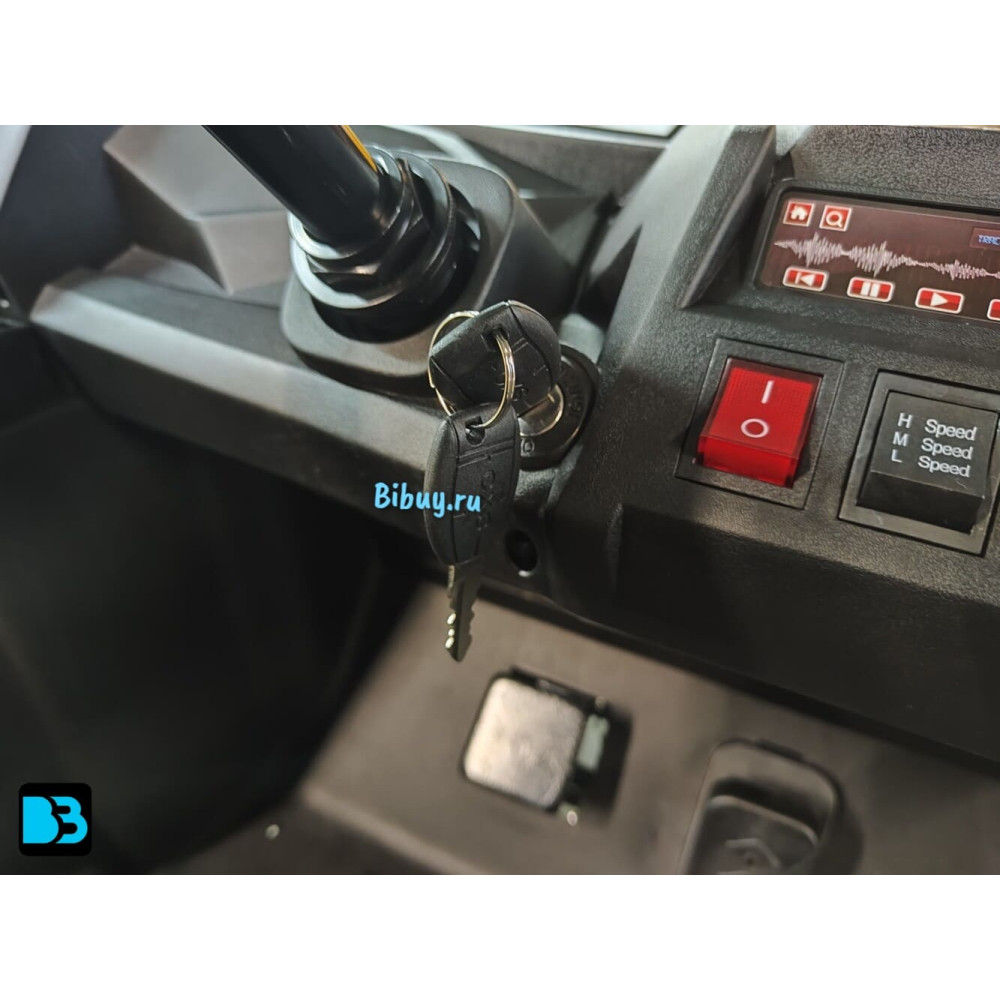 В движение электромобиль приводится с помощью ключа (как у взрослых). Скорость развивается плавно, её максимум 15,5 км/час, это быстро и безопасно для данной возрастной категории пользователей. Есть возможность переключения хода вперёд/назад (3 режима).
