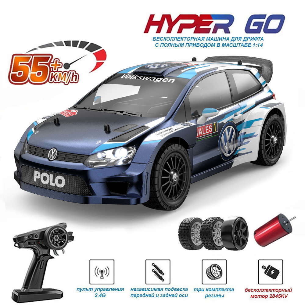 Радиоуправляемая машина для дрифта MJX Hyper Go VW POLO 4WD 1:14 - MJX-14304 - это новая модель от популярного производителя MJX R/C. Автомобиль выполнен в масштабе 1/14 и отличается от конкурентов наличием 3-х комплектов колес (для дрифта и шоссейных гонок), интеллектуальной аккумуляторной батареи, бесколлекторным двигателем с системой охлаждения, дополнительным чехлом для защиты от грязи и песка, а также оптимальным соотношением цены и качества деталей.