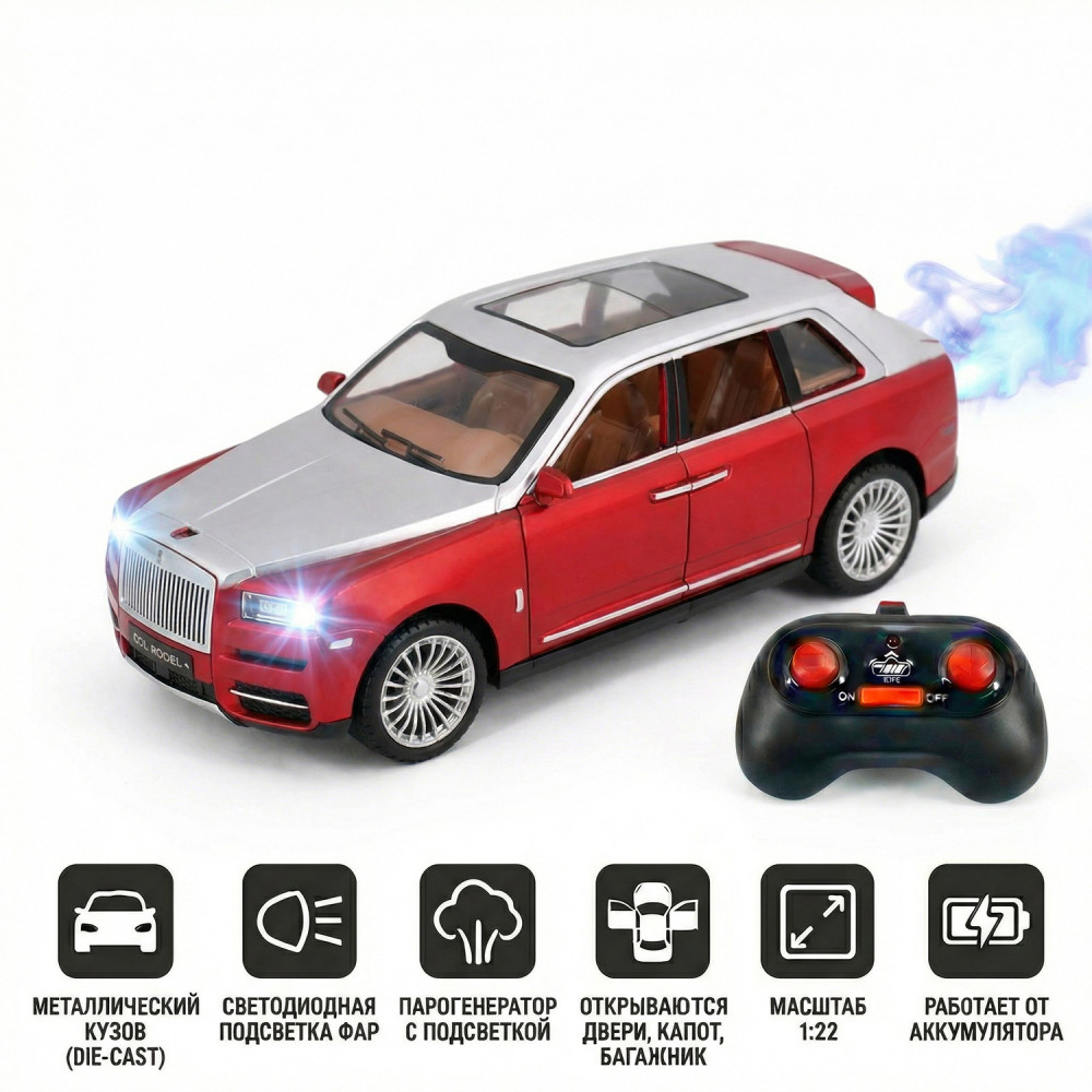 Радиоуправляемая металлическая машина Rolls-Royce Cullinan 1:22 - HCL-3806-RED - это стильная и детализированная модель с кузовом DIE-CAST, светодиодной подсветкой фар и эффектным парогенератором с подсветкой. Открывающиеся двери, капот и багажник делают модель максимально реалистичной. Отличный вариант для игры и подарка.