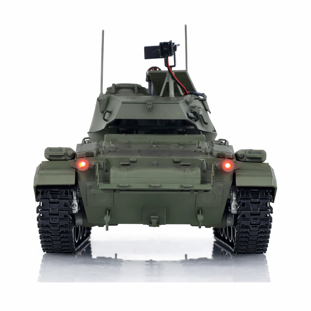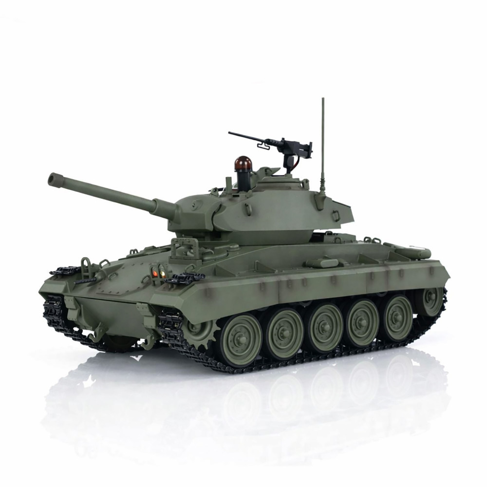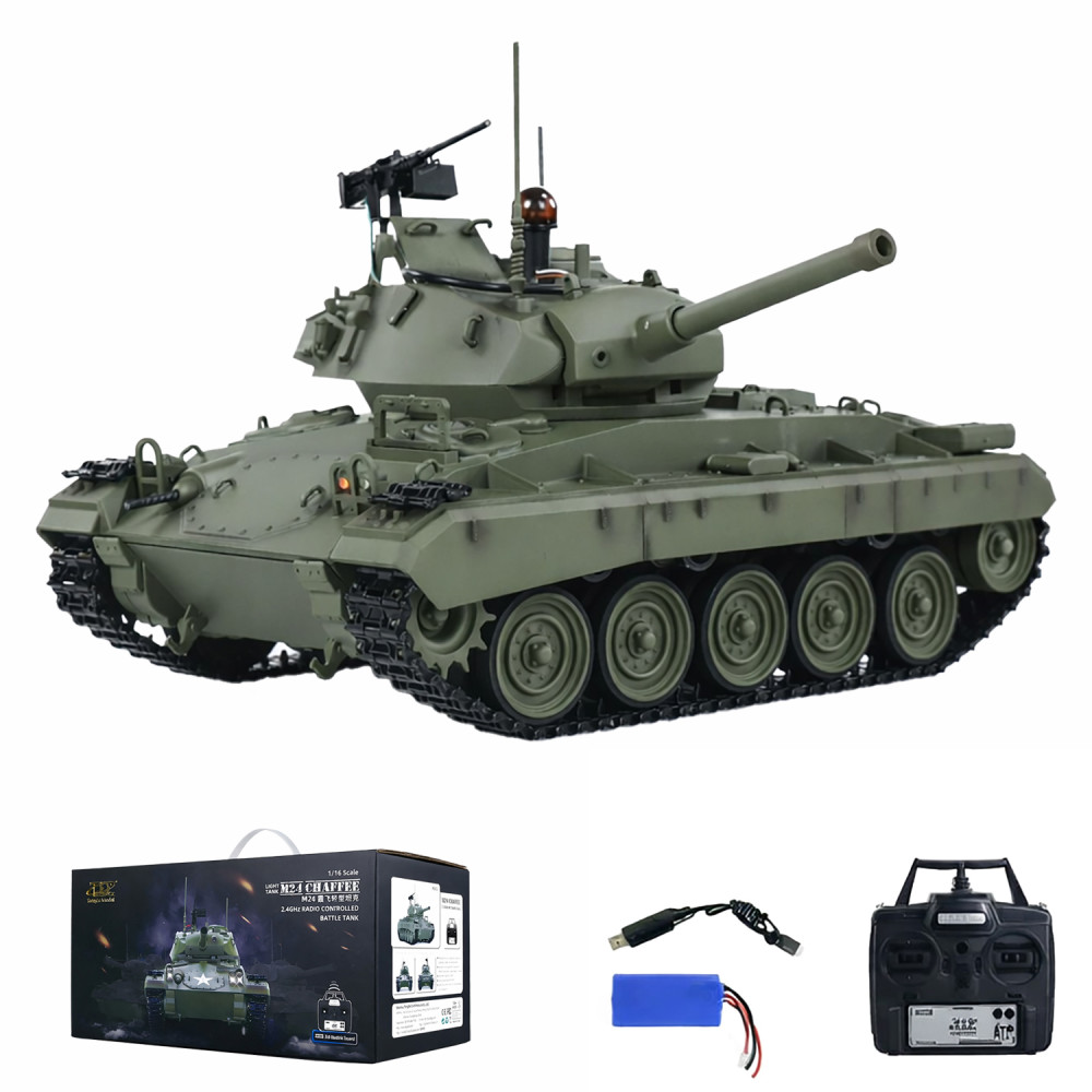 Радиоуправляемый танк M24 Chaffee - TD-M2402 - это американский лёгкий танк, разработанный в середине 1940-х годов компанией Cadillac. Опыт боевого применения в Африке лёгких танков М3 и М5 показал, что эпоха лёгких танков с угловатыми корпусами и вертикальной подвеской подошла к концу, их конструкция была признана устаревшей. В 1943 году началась работа над совершенно новой машиной. Техническое задание, помимо усиленного вооружения, предусматривало максимальную массу не более 18 коротких тонн, а также использование корпуса и башни рациональной формы. Первый прототип лёгкого танка под индексом Т24 поступил на испытания в октябре 1943 года. Прототип оказался столь удачным, что немедленно был сделан заказ на 1000 экземпляров данной машины, при этом производство было организовано ещё до его официального принятия на вооружении под индексом M24.