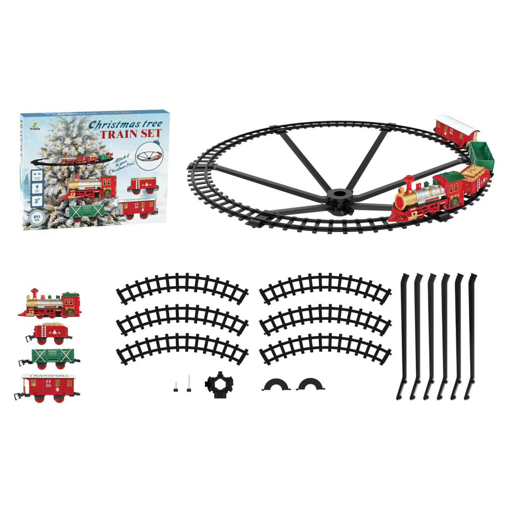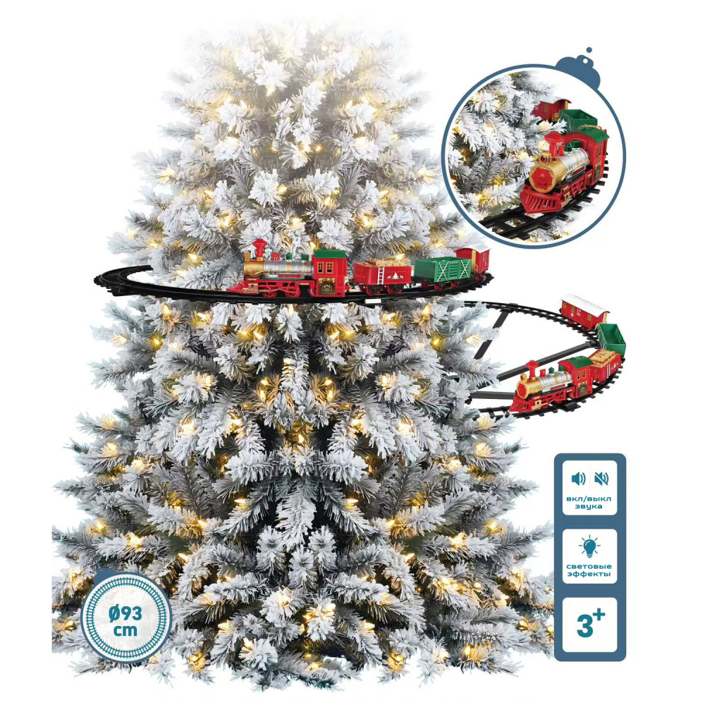 В комплекте можно найти детали дороги, специальные крепления и болты, паровоз, 3 вагона. Пошаговая инструкция на обороте коробки поможет правильно закрепить железную дорогу на стволе елки. Световые и звуковые эффекты добавят реализма игре. Крепление регулируется под елочный ствол любой толщины. Для успешной работы железной дороги объем елки не должен превышать 90 см.